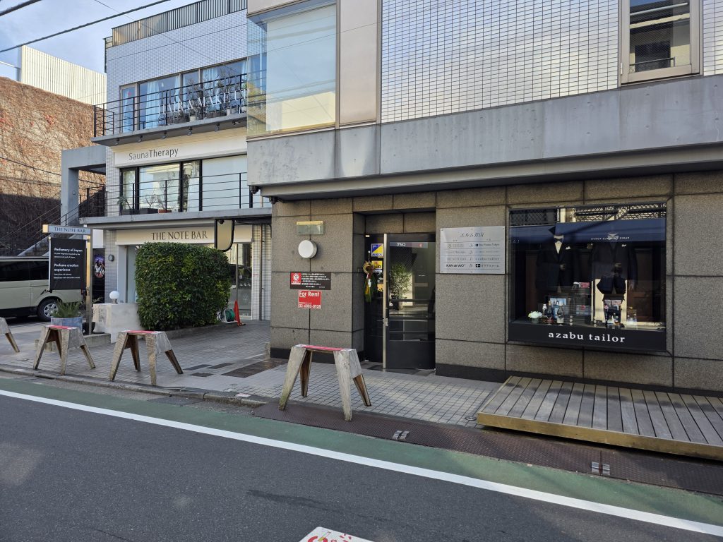 路地の突きあたりにSky Pilates Tokyoがあります。青いロゴの看板が目印です。